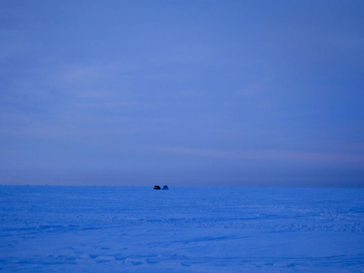 По отсыпке, потом по зимнику, с километр отворот к берегу моря. Выезжаем в няшу. Машин мало на берегу, в основном все в море подались, и расположились большим веером по левую руку в направлении к острову Лебедину.