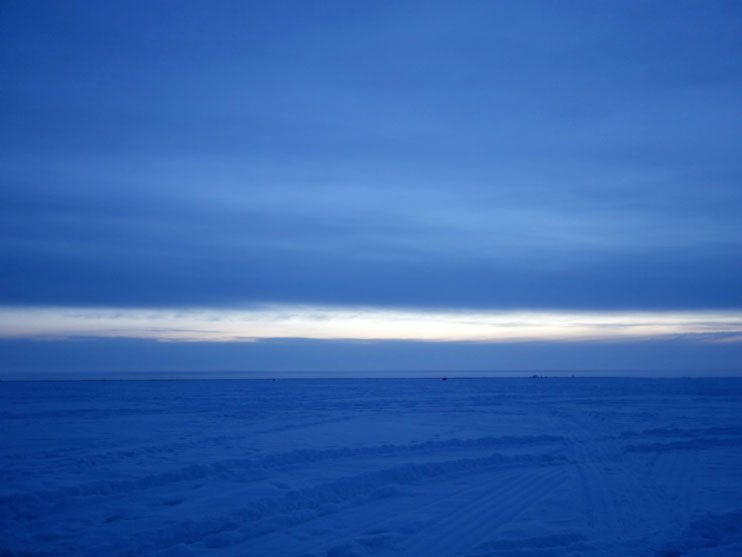 Едем потихоньку по накатанной колее, когда тепло , хорошо, можно сориентироваться, у кого клюет, у кого нет. Тут рыбаки по палаткам попрятались, никто и носа не показывает. Поди узнай, как дела. Дорулили примерно до середки народа. Так как цель рыбалки была корюшка, двинулись, как можно дальше от берега. Расположились весьма на уютном пятачке. Поблизости никого, есть где рыбка разгуляться - засверлились.