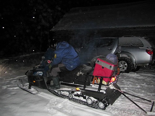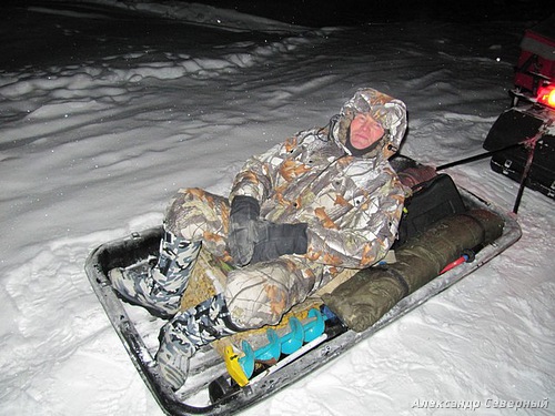 Федорыч, как хан, усаживается на волокушу, я привычно на заднее сиденье снежника.