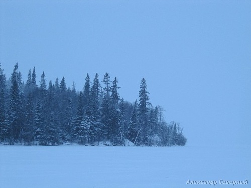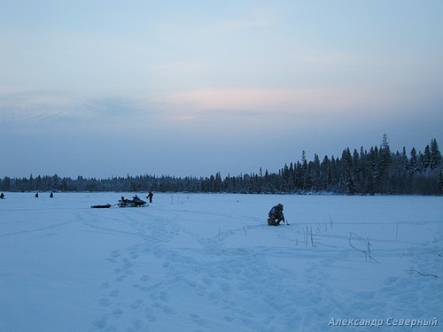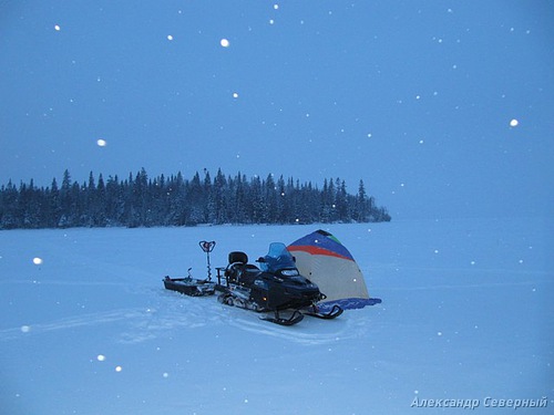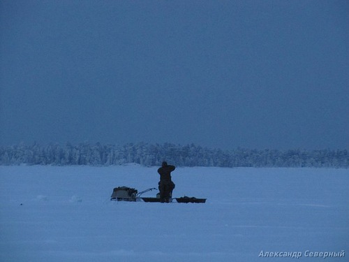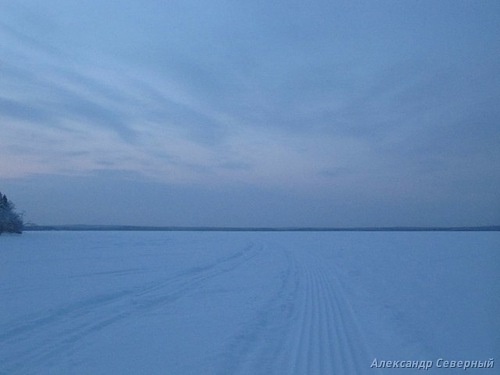 Уже приехали. Раньше сюда на Уралах да вездеходах сутками бились. Сейчас, как по мановению волшебной палочки попадаем. Сворачиваем с основной дороги, идущей дальше в поморскую деревню Яреньгу. Заметные путики снегоходов пронизывают нитями многокилометровую поверхность озера. Выбираем наш. Отдаляемся от берега по касательной, плавно огибаем огромный мыс, делящий озеро на две части.