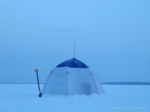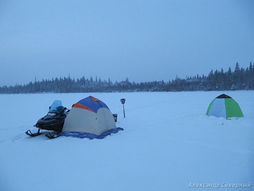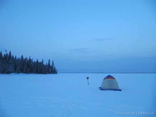 Рыбалка идёт своим чередом, палатка постепенно погружается в сумерки. Через прорывы в пологе вижу, что на уле светло. Понятно. Осталось совсем немного времени. Холод завладел мной, проказник. Представляю ближайшую поездку на Снежнике. "Не-е, пора заканчивать. пару сковородок поймал, мне вполне хватит". Посчитал, с полтора десятка будет. Домой жарёха, мне удовольствие. Собираюсь. Кричу ребятам, что пойду, прогуляюсь да посмотрю красоты. Руки отгреются, может поснимаю немного.