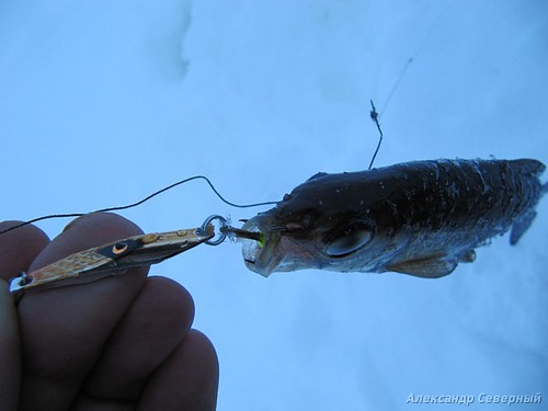 Время к обеду. Моя уверенность тает со скоростью нарастания мороза. Крепчает шалун на глазах. Забирается, куда не попадя. Тут уж не до замены блёсенок. Вдруг, после одного из многочисленных подкидов, уверенный удар по кивку. Уда приятно пригружается подсечённой чудесной рыбкой. Ввожу в лунку. Глаза засверкали радостным сиянием и сильно таки большие стали, аж, с блюдечко чайное:)