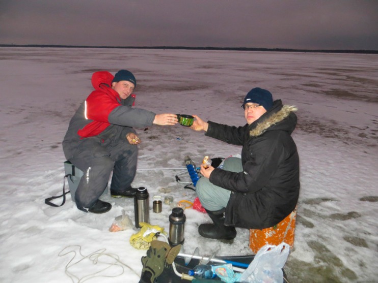 Серега аж термос от удовольствия уронил, поднимать некогда, надо рыбу ловить. Азарт, поди!