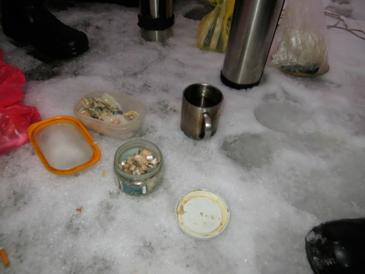 В баночках рядом прикормка и наживка скумбриёвая расположена, эт така примета, что сам на стол ставишь, тем и рыбку потчуешь :))) подругу свою.