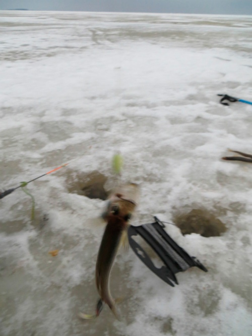 И первая поклевка следует, будт пробует вначале, тыкает, кивок лишь слегка притормаживается, приготовился, вновь торможение, подсечка. И первый свежий огурчик трепещется на льду!