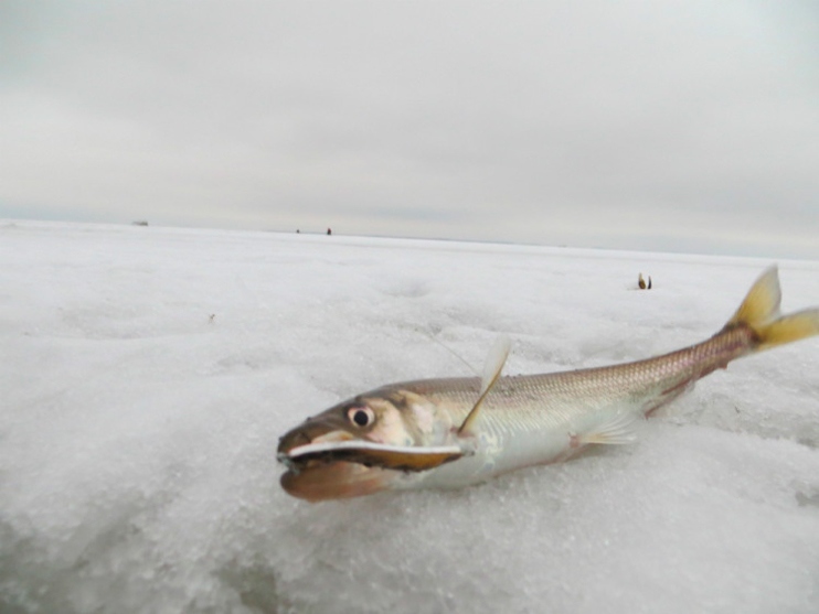 Перекусили плотно, и айда по лункам. Договорились, как попадётся больше трёх, «свистать всех на верх» или по рыбацки «сразу бур ставить». Не успели напарники от меня отойти и на сто метров, как вижу кивок шевельнуло. Иль показалось. Ветер то сильный вдоль русла тянет, кивки покачивает, даж не надо играть. Посиживай на ящичке, да поглядывай. Правд, порывы не предсказуемы, то лишь шевельнет, то так раскачает, что уж не поймешь клюёт иль нет. Беру уду в руку, так вернее. Блёсенка тяжелая. Кивок приятно покачивается. Легко шевельнешь рукоятью, и он отыграет медленно, за собой пружинисто блесну вверх увлекая. Дашь, вниз опустится, блесна кивок нагрузит, вновь вверх плавненько качнешь. Заметил, морская рыба не любит суеты и мелко-быстрой тряски. Ей подавай вальяжность и размеренность. Трудно с рукой совладать после городской суеты да шума, зато, как настроишься, то будто песню запоешь, протяжную, таку тягучую. Мож и река песню поёт, водами подо льдом порхая, то прижимает струёй лесу, то отпускает. И чую музу и просто подхватываю и пою в такт с ней.