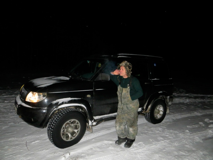 Цигарку покуривая. Сам не курю, от посмотреть, як люди этим делом увлекаются, всегда с удовольствием. Лица у них умиротворенные всегда и прост вся жизнь, что прошла прописана, лишь всматривайся. Не зря видать от той привычки трудно отойти, кромь вреда есть в ней своя философия. Несколько машин ткнулось в темень, сдали назад, несколько пошли пробиваться в сторону мыса Сенного на сиговые плантации. Нам ждать невелено. Немного по пробитой колее, дальше. Ааа, погнали! – так первыми до острова Мудьюга почти на маяк Белую башню, потом отклоняемся правее между мысом Заичьим и коренным берегом. Старую, занесенную колею отлично видно. Жми на газ и не зевай. Да впрочем те ропаки и снежные наносы Патриоту нечета, проносится, даж не замечает! Сзади огоньки вереницей, разной иномарочной техники засверкали. Нормально, терь по колее потянутся рыбацкие колонны за корюшка. Краса рыбка, вкусна и сладка на скус. Ммм поджаренная, подрумяненная, а скоросолочка, а коли завялить? Нет, ничего скуснее. Не даром мудрые мужи пытались те места к своим рукам прибрать, да получить с каждого рыбака мзду немалую. Правд, трудно могли объяснить за что? Потому по белым, то волосатым ручкам мудрый правитель России их настукал. И терь рыбак ловит в любом месте, где душа его пожелает. Дорожка быстро стлалась, до места с километр иль два, приостановились покурить. Колонна с разгону мимо пролетела, да и здорово. Любо в сторонке от большого скопления рыбаков ловить. Своей компанией, вроде и рыбаки рядом, в тож время можа друг с другом спокойно переговариваться, да чужих секретов и да разных иных словечек от соседских компаний не слышать :-)