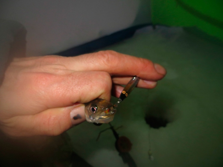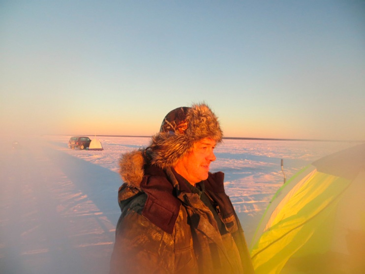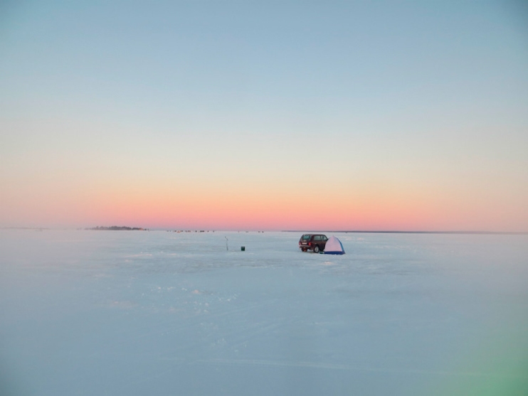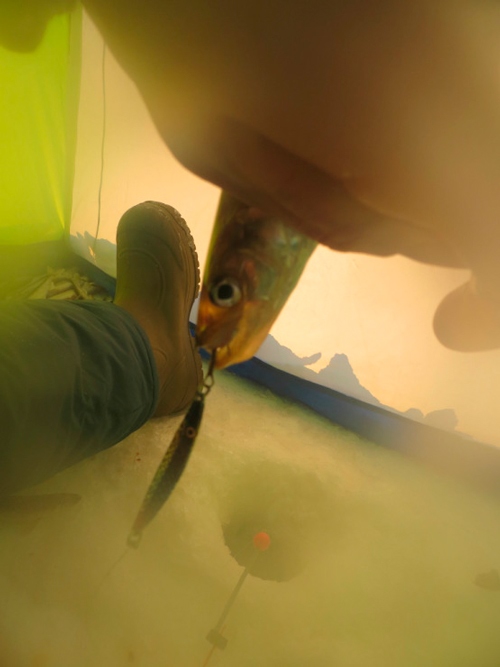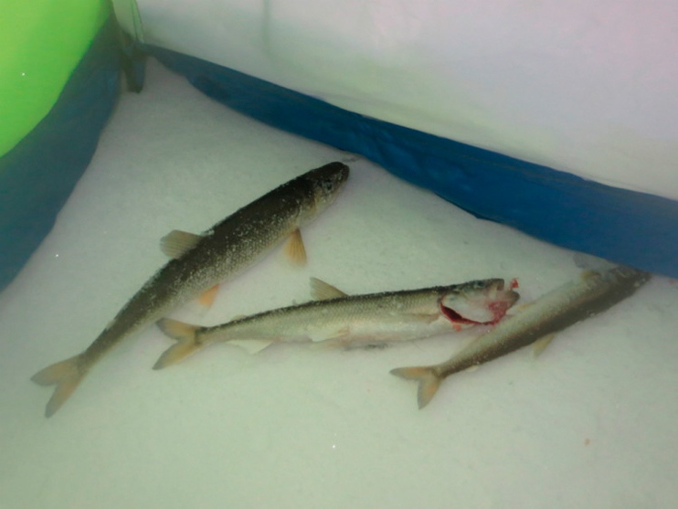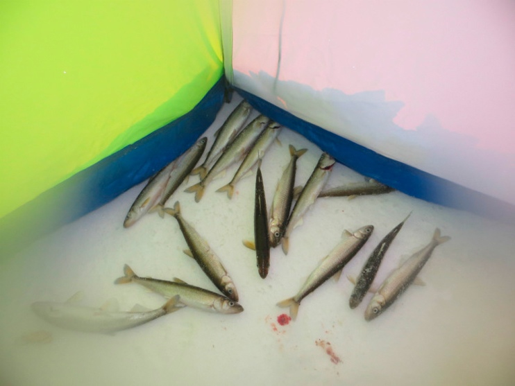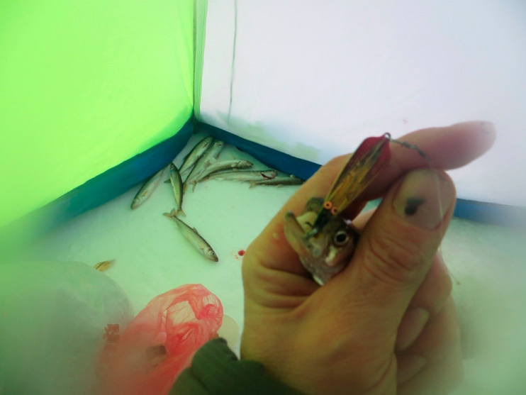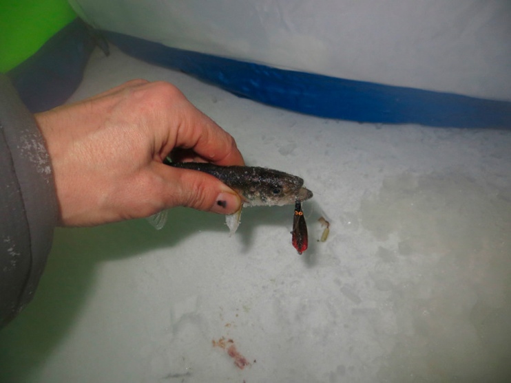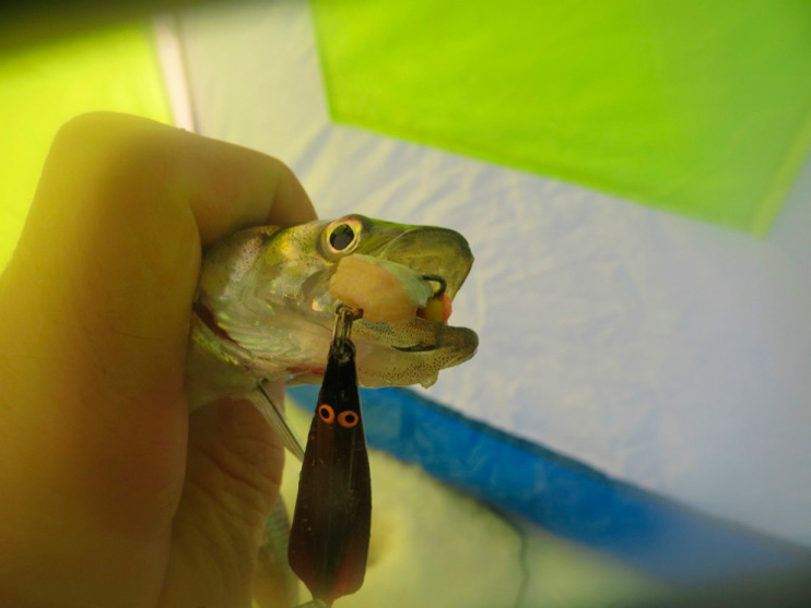 Погулял покругу, Михаил завел машину, и я решил подремать до лучших времен. Проснулся уж около двух дня. Слышу, вроде разговор, что начало пошевеливать. Выбираюсь, и точно, вода повернула на убыль, течение усилилось. Запускаю в палатке первую блесенку. Перед дремом их благополучно кверху поднял. Маленький корюшок