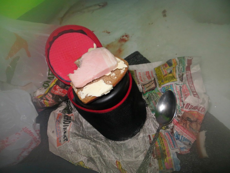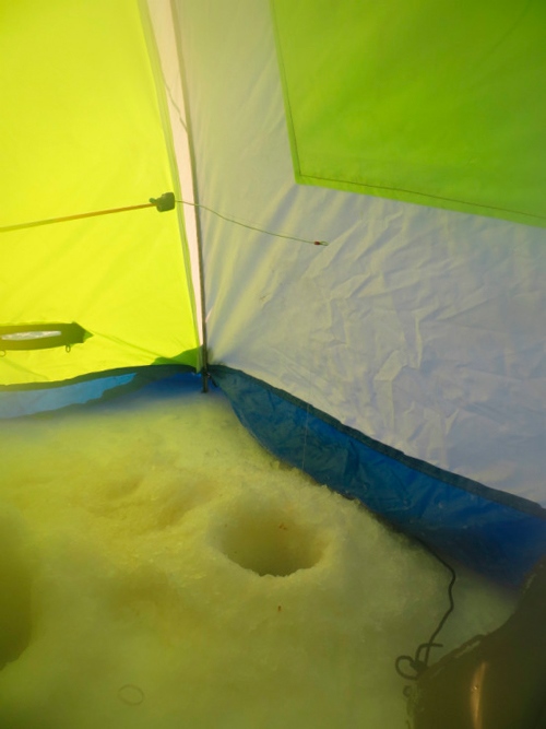 Темно, пока не позарило солнышко небо, прилег вздремнуть. Настюшку, дочу, немного штормило ночью, спать малось пришлось. Тут как раз кстати, подремать. Сам дремлю, ухо востро, как, где и что? Коли клюнет, сразу буду рыбацкое место оборудовать. Слышу краем уха в Маргариты первая поклевка, так пора на рыбалу! Отхожу в сторону от ребят метров на тридцать, бури четыре лунки вдоль течения. Ставлю палатку, запускаю снасти. Прикормку размещаю на третью луку для начала, коли считать снизу вверх против течения. Иногда корюшка скатывается по течению и берет без прикормки. То есть будет клевать на удочку расположенную выше по течению, проверим.