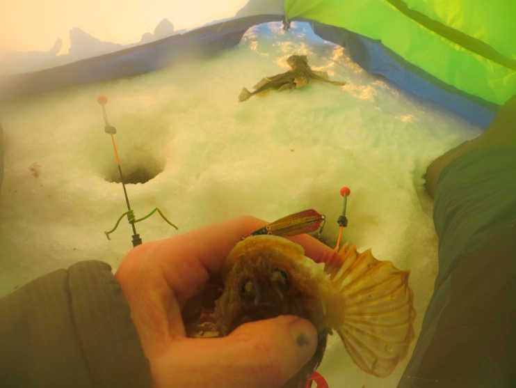 забрался в палатку, попытался еще корюшку выманить. Поклевка интересная, вначале ударчик вниз. Подсек, промахнулся, у дна придавило. Потянул, приятное сопротивление и будто кирпичик висит. Понятно кто пожаловал.