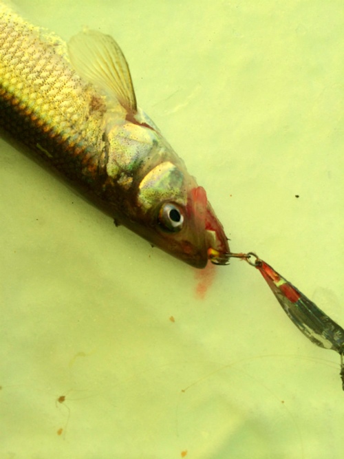 Правда, клюет на нимфочку и плоскую блесенку похожую на кончик стрелки иль самолетик детский, что из бумаги вырезали. Кстати, подумалось, что форма именно бумажных самолетиков отлично бы подошла для блёсенок планирующего типа. Блёсенка, похожая на глаз, почему то сегодня себя кроме, как с ряфчей, никак не зарекомендовала. Меняя её на изогнутую змейку, правда, немного тяжеловатую для столь малой глубины. Ничего попробую.