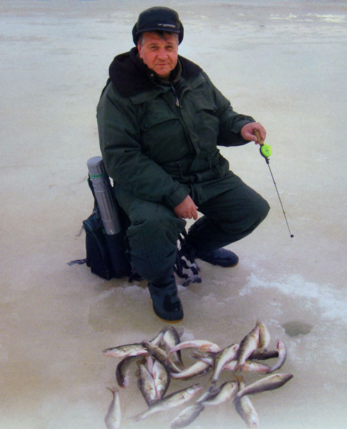 Так проходит час. Клев хорош всюду, работают все блесны. Особенно хороши некрупные вертикалочки фирмы Аква, отлитые из баббита, а у самого берега, где подо льдом всего 20 сантиметров, мелкие судачки отчаянно хватают балансиры.