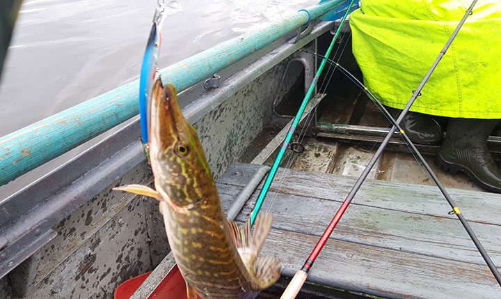 Лодка продолжила медленный разворот, и как только мы направилисьв сторону берега последовал очень хороший удар по моему воблеру, который был только что опущен снова в воду и не успел далеко уйти от лодки. Метров с 10-15 я вытащил щуку чуть поменьше предыдущей.