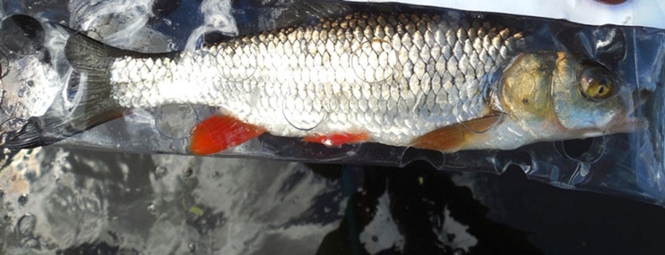 Медленно провести воблер не получится, сразу уйдёт ко дну и зацепится за водоросли, что и случалось на первых трех проводках. Попробовал провести воблер быстро, чтобы игра не сбивалась, и ближе к середине реки плетёнка натянулось, возле воблера всплеск, подсекаю – голавль! Наконец-то! Пусть не рекордных размеров, но все же - голавль! Фотографирую в специальном пакете и отпускаю. |