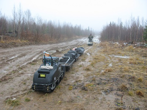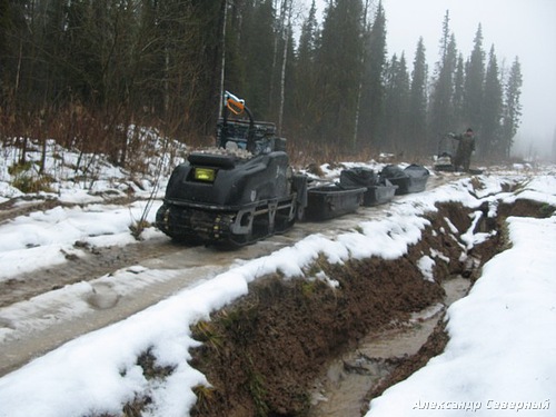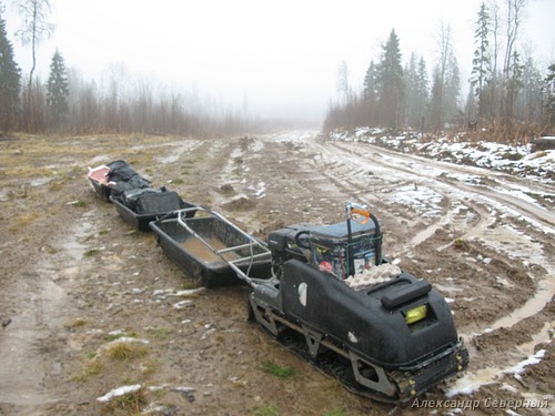 Обмениваемся первыми впечатлениями о дороге, погоде. Минут через десять трогаем дальше. Быстро и легко отрываюсь от Юры. Ничего подожду. Даже интересно ехать. Природа меняет свои состояния, приходится меняться и мне. Приспосабливаюсь к новой манере движения, к заносам на льду и к маньячному желанию счистить присасывающуюся к днищу волокуши глину. Иногда изменяю направление движения на поперечное. Секу колеи, они, как щётки, освобождают мой поезд от лишнего груза. Выскакиваю на траву и разгоняюсь. ликуя.