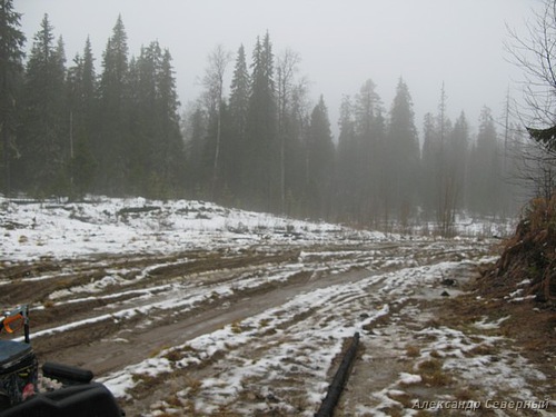 Когда приоткрылся левый глаз, понял, что сереет. Здорово! Бетонка стучит и стучит под колесами, то плавно покачивая, то лихо подбрасывая. Бок задеревенел от лежания. С треском потягиваюсь, расправляюсь. Протираю глаза: «Доброе утро, тайга». На обочинах остатки октябрьского снега. Как ему удалось до ноября продержаться? Дождь его полосовал, хлестал и мыл. Он, как зацепился здесь на перевале за земельку, так и не отпускает. Припал ко мху, укрыл. Видать сдружились сильно. От и наш отворот. Весь раскис до слизи. Фу, какая скользкая глина. Даже к ногам не прилипает. Просто стекает. Представлю по ней пешим идти. Растяжение через километр обеспечено. Еще через пару плюхнешься и станешь чистым и аккуратненько извоженным лесовичком. В глине и в листьях.
