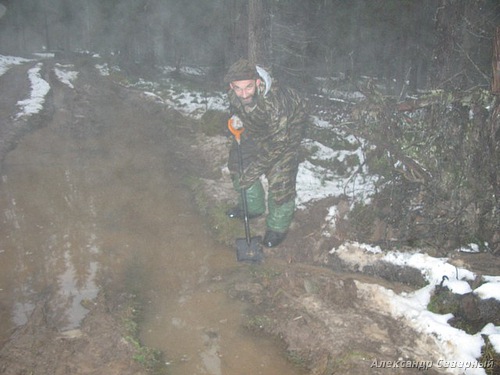 УАЗка хорошо потрудилась в ельничке. Беремся за лопаты. Спускаем вновь образовавшиеся лужи. Их гораздо меньше, чем в прошлый раз. Знали бы ребята, благодаря кому, им удалось в этот раз до избы прорваться:)