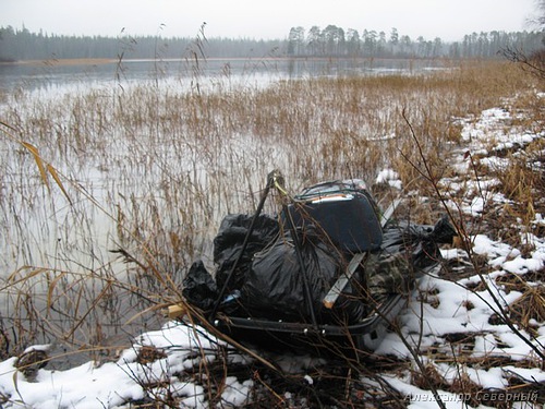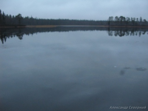 Вначале пробуем пройти через озеро. Втыкаемся в лед. Не-е, слишком толстый. Смысла нет рубиться. Да и не понятно, какая погода дальше будет. То затянет полынью, потом думай, как обратно попадать.