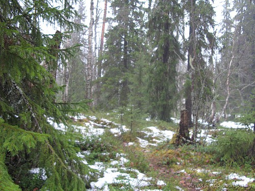 С неба, то начинает лить дождь, то успокаивается, одаривая мелкой изморозью лицо. Дышится великолепно. Кругом парит, что весной. Тепло. Уютно. Ветерок не набрал обеденной мощи и лишь немного раскачивает верхушки уцелевших после вырубов дерзких елей.