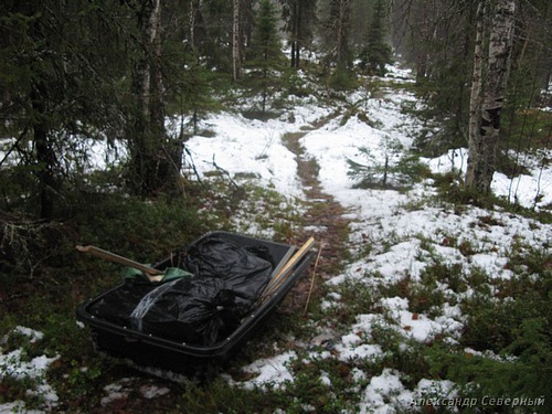 Пристаем к противоположному, уже родному берегу. Как же переместить огромное количество вещей к избе, расположенной в километре от импровизированной пристани. Попробовать что ли и на волокушу сложить? Половину гружу себе.