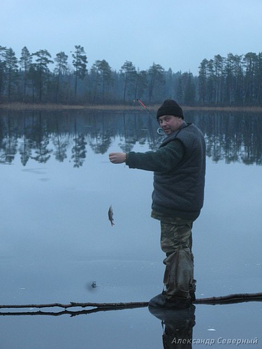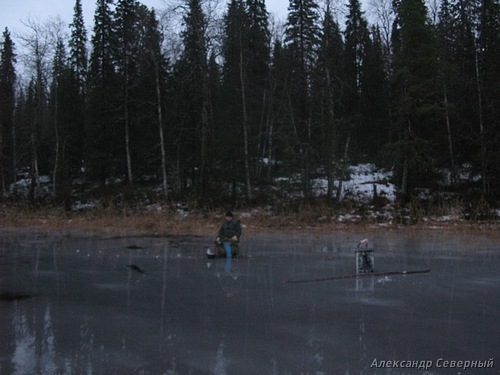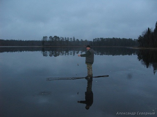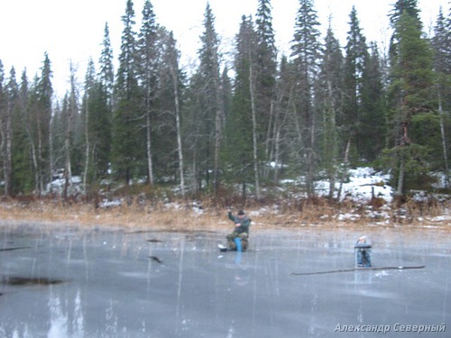 Сам на мели сижу, по нолям. Поменял двухглазика на одноглазого «Око». Минут двадцать тишина. Дальше лёд совсем тонкий. Да, пойду к избушке. Видать сегодня не мой день. Напарник тем временем еще одного окушка поймал, подался жерлички поставить. Мне ж лень по старому следу и гати на берег возвращаться, шурую прямо через тресту. Ледок прогибается, быстрее и быстрее, и я быстрее и быстрее перебираю ногами. До берега совсем ничего осталось! Ба-бах проваливается нога, и сразу вторая. Я ж, как колесный пароход молочу ногами. От чего-то там отталкиваюсь. Вылетаю на сухую траву. Фу! Лишь чуток грязью чуню сверху залил. Задираю ногу повыше, сливаю попавшую воду с тиной. Закатываю чуню, протираю насухо штанину перчаткой. До портянки не дошло. Так, что все нормаль.Мой провал.Погодка же разгулялась, хоть куда. Все предпосылки к вечернему заморозку. Тогда оторвёмся!Юра кричит, что последняя жерличка размотана, живца-сорожки нет. Да там её уже не поставить. Вода из лунки фонтаном. Что ж делать то? «Ставь где може-е-ешь!!!!! Могу-у-у!!!» - перекликается над озером.