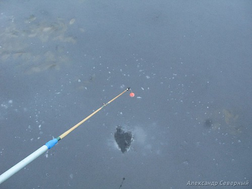 Пару ударов по лунке. Смотрю жерличку. Окунёк на месте. Вода ж из лунки попёрла шустро.