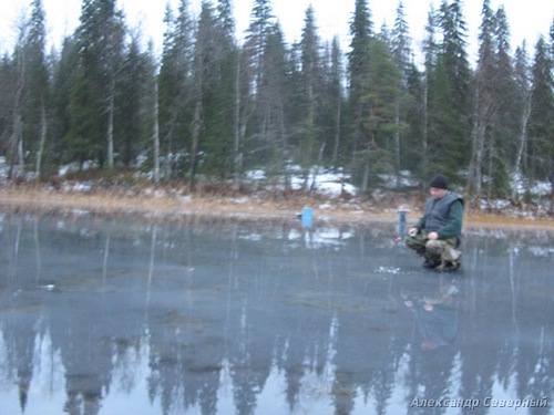Лёд затрещит, он палкой потыкает, коли пробивает на конце гвоздь, то обратно пятится. На старой лунке, где в первый день поймал пару окушков и сорожку, половить не получилось. Подъехал на своем летающем корабле, пробил старый ледок, вода из лунки пошла. Мне даже со стороны виден фонтанчик.