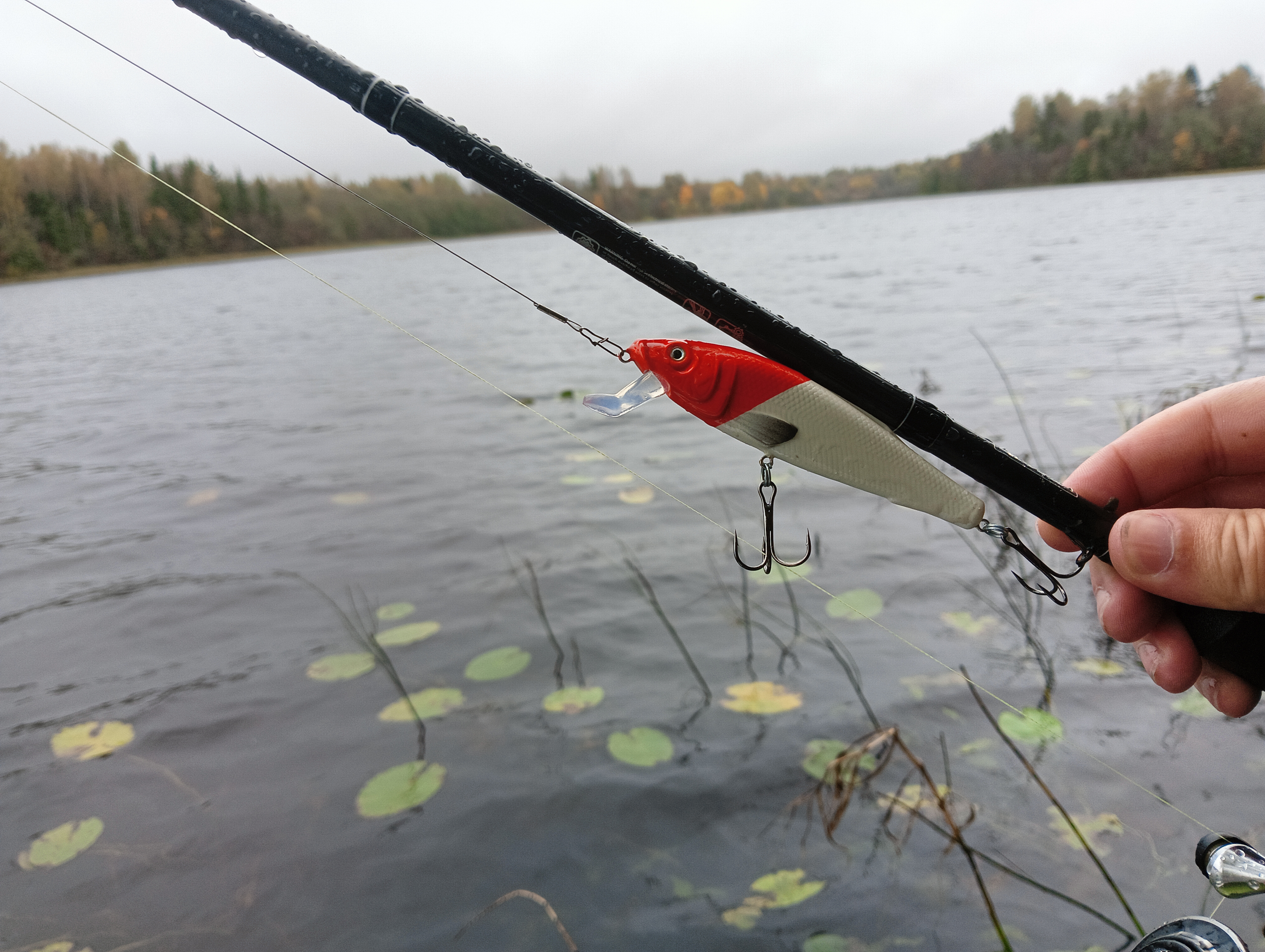 Начал с обкидывания залива, и на очередном забросе во время проводки заметил, что мальки плескаются впереди воблера врассыпную. Ну, в принципе, бывает, что мальки сопровождают приманку, потому что она очень схожа с живой рыбой. Но тут оказалось всё интереснее: это сзади за воблером плыла небольшая щука, и они уплывали от неё. До самой лодки дошла, но, так как, видимо, я ловил стоя, она меня увидела, заподозрила подвох и не стала атаковать воблер.