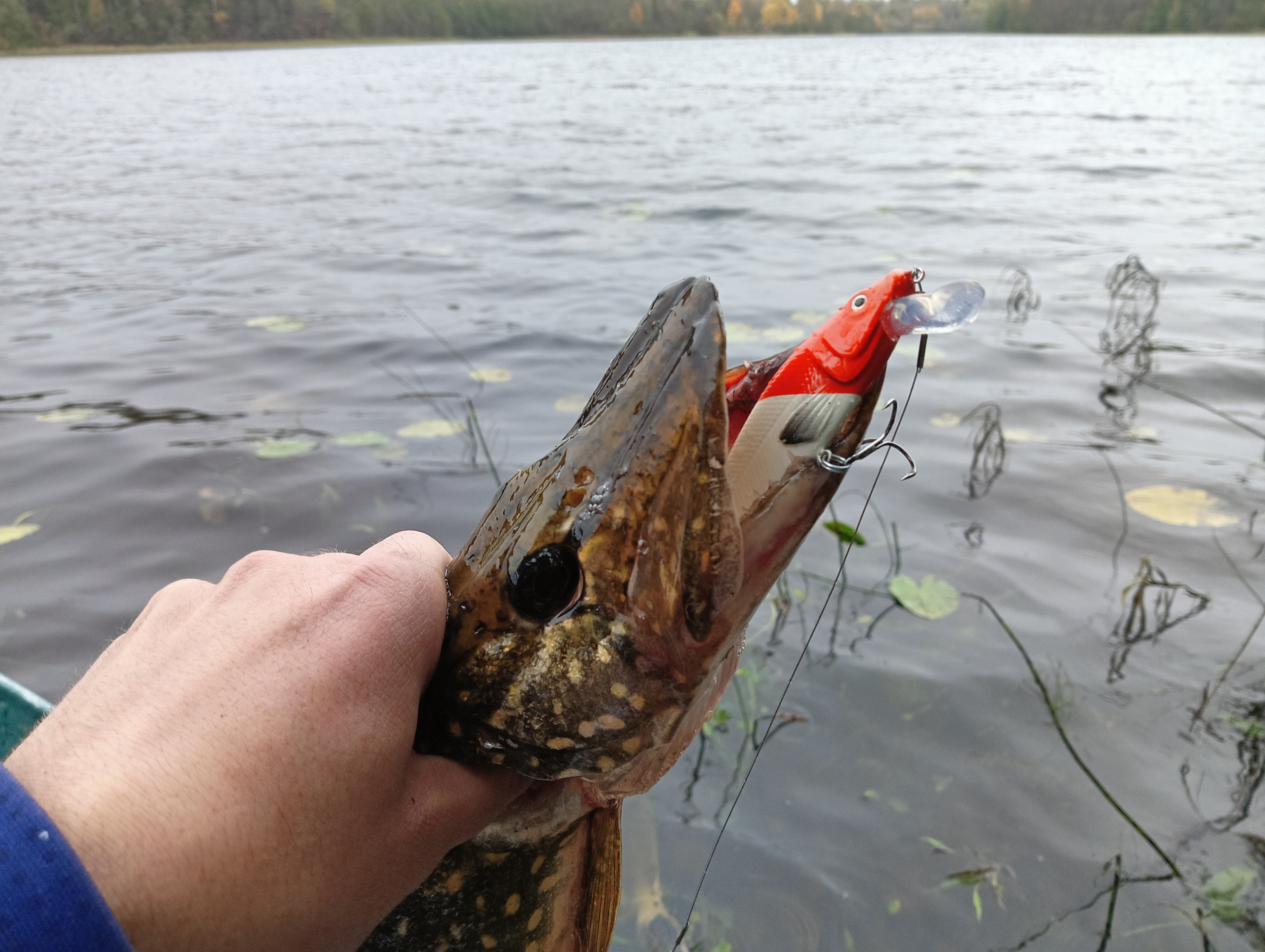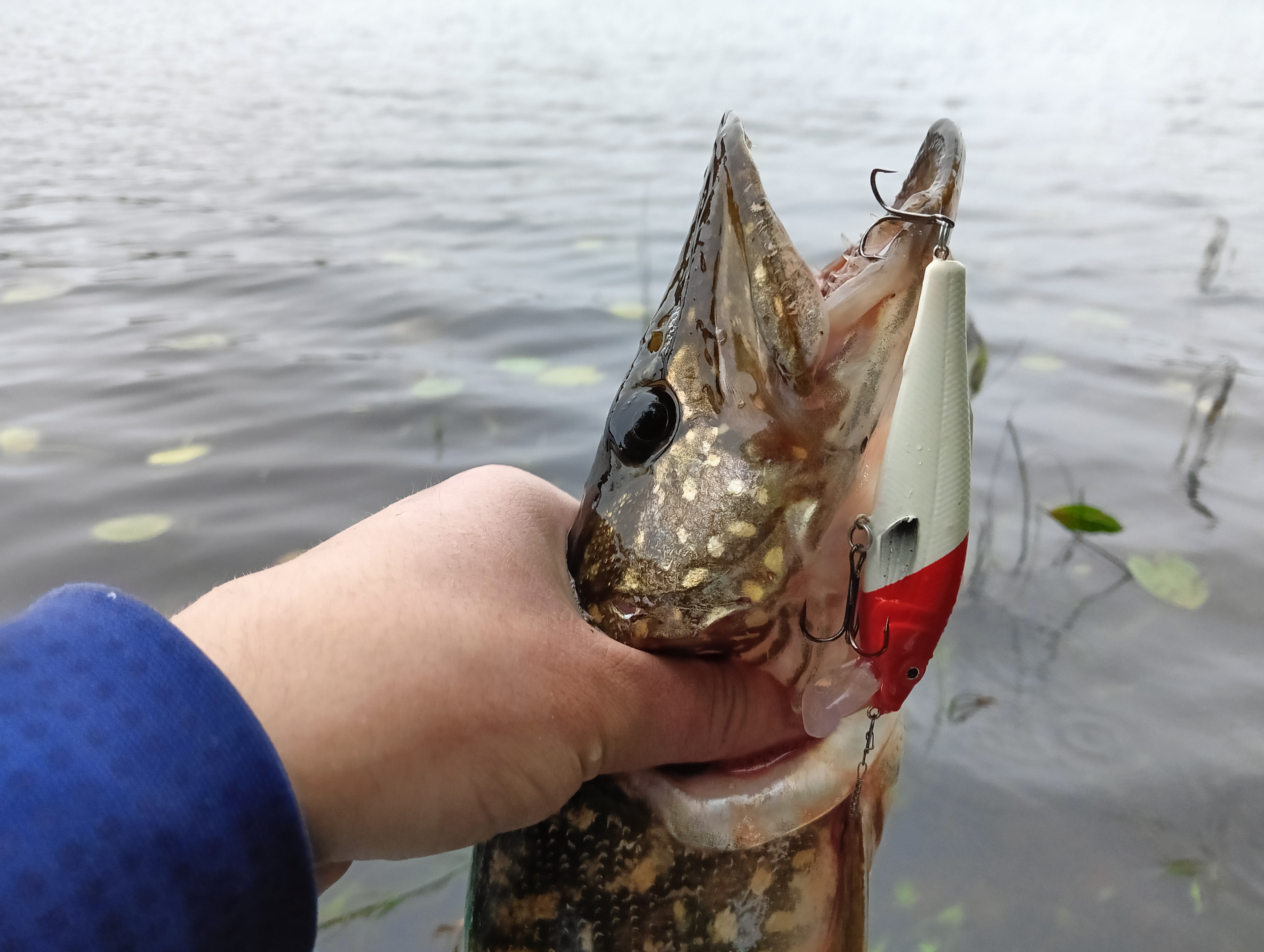 Тут тактика ловли была следующая: максимально дальний заброс и быстрое заглубление воблера до рабочего диапазона, а дальше — эксперименты с проводкой: со скоростью, длиной паузы и прочим. И это принесло успех. Как и с первой щукой, сработала ступенька: когда на паузе давал чуть всплыть и снова заглублял за счёт проводки, клюнула опять щука, очень похожая по размерам на первую, также за задний тройник, только не в пасти весь воблер.