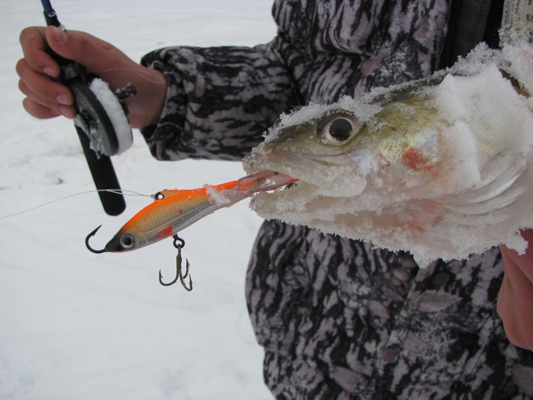 Начинаю проходить линию лунок на глубине 7 метров. На третьей Гектора нагло атакуют, на плетенке промахнуться сложно! Судак сидит уверенно – полбалансира в пасти! Снимаю эту красоту и продолжаю.