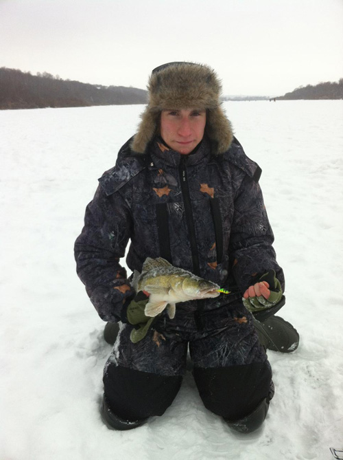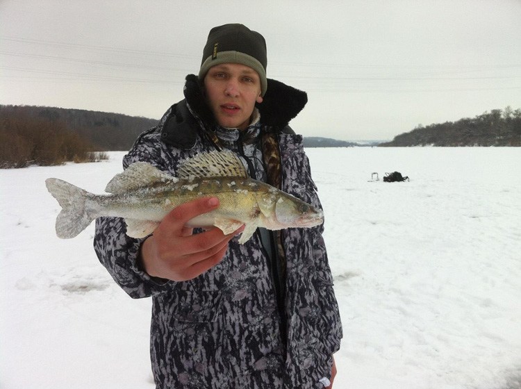 Продолжаю, времени остается часа два, а половить хочется успеть, поэтому в каждой лунке по 10 взмахов и перехожу на другую. Холодно, лунки мерзнут, моментом, но судак ловится. С блесной реализация поклевок резко падает – пустые удары следуют чуть ли не из каждой лунки. Пара сходов в последних лунках, затем еще судачек. Нет-нет, а атакует в тройничек! К четырем часам вечера начался настоящий выход. Очень много поклевок, поимки случались у нас всех, но в соотношении 5 к 1. Я отличаюсь через 2-3 лунки. Судак мелкий, но поклевки очень приятные.