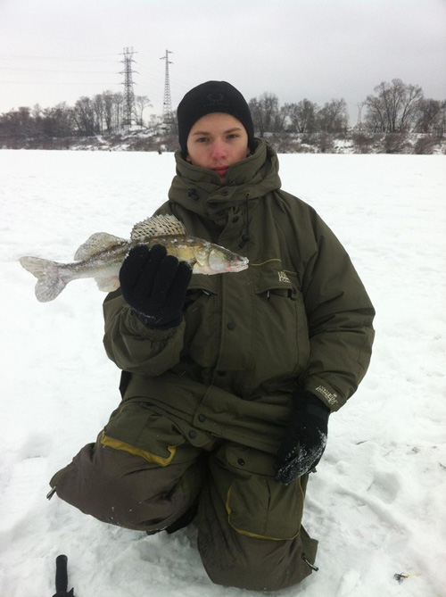 Саша кричит в трубку что-то нечленораздельное, но я успеваю разобрать слово "судак", после чего взяв с собой снасть, направляюсь к товарищу. Подхожу и вижу, друг сидит у ящика, а у его колен, на льду кувыркается судак. Навскидку килограмма полтора, настоящий трофей для этих мест! Со слов Саши, рыбина атаковала на двух с половиной метрах с сильным ударом и после вываживания застряла в лунке с окуневым балансирчиком Аква в зубах. Пока товарищ лез за багром, рыба сама выползла из лунки на лед. Поздравляю с добычей Сашу, представляю, что он пережил с моим коротким удильником леской 0,16мм. Фотографирую, получается красиво, не смотря на порядком замерзшие руки.
