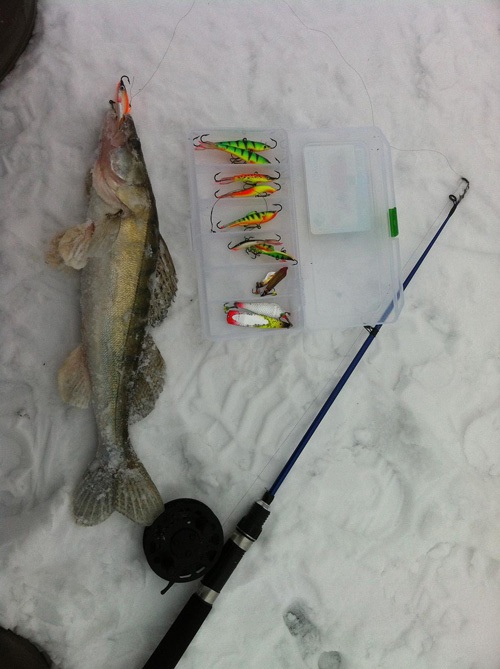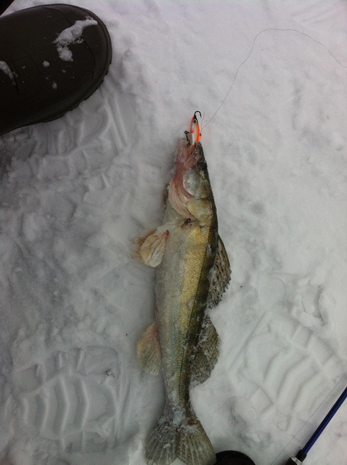 Спешу с вываживанием, чтобы рыба не сошла и быстро выбрасываю на лед судачка где-то на полкило. Приманка надежно ухватила "клыкастого".