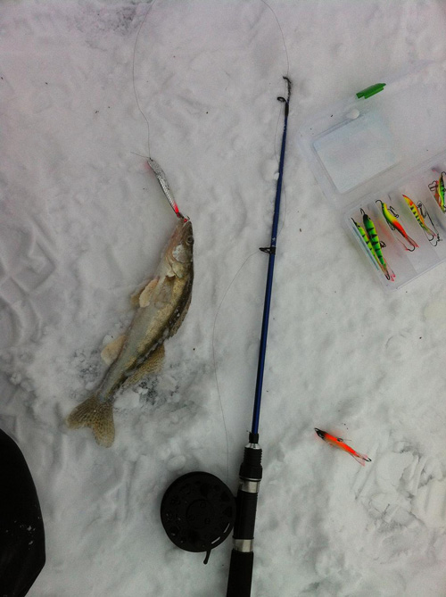 Первая же лунка, взмахе на 7-ом сильный удар в балансир, просекаю. Тащу метра три, затем рыба сходит. Снова активизировался судачек. Этот был не менее полукилограмма.