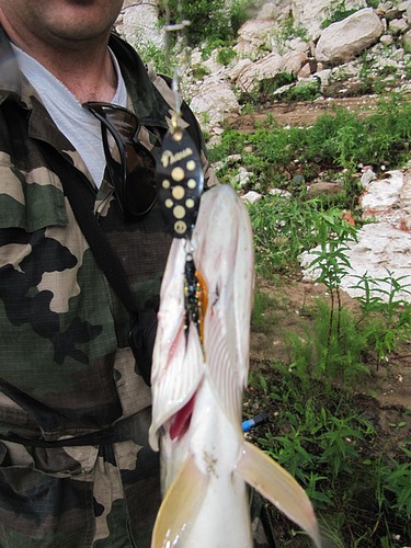 Сережа, зацепил щучку покрупнее на классического плавающего воблера «Красную голову»
