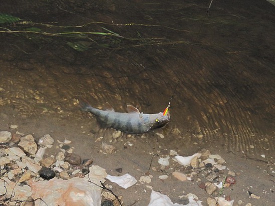 Подкидываю вертушку подальше от берега. После удара о воду слежу над погружением нити, как блесна коснётся дна, нитка замирает на долю секунды и затем подхваченная течением вновь бежит под воду. По расстоянию межу приводнением блесны и местом замирания нити сужу о глубине лова.