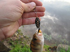 Экспериментальным путем достигаю желаемой скорости проводки и горизонта воды, в котором хочу вести блесну. Приподнял кончик, кручу рукоятку катушки в среднем темпе. Тырк, окушок интересуется, тырррк, засёкся. Чуть подсекаю на себя и начинаю подматывать побыстрее, слежу, чтобы рыба не подпрыгнула из воды и особо не заглублялась. Всегда есть возможность кончиком удилища ускорить движение или замедлить. Окуш показался на поверхности. Лег на бок. Дотянулся до берега. Приподнял. Попался.