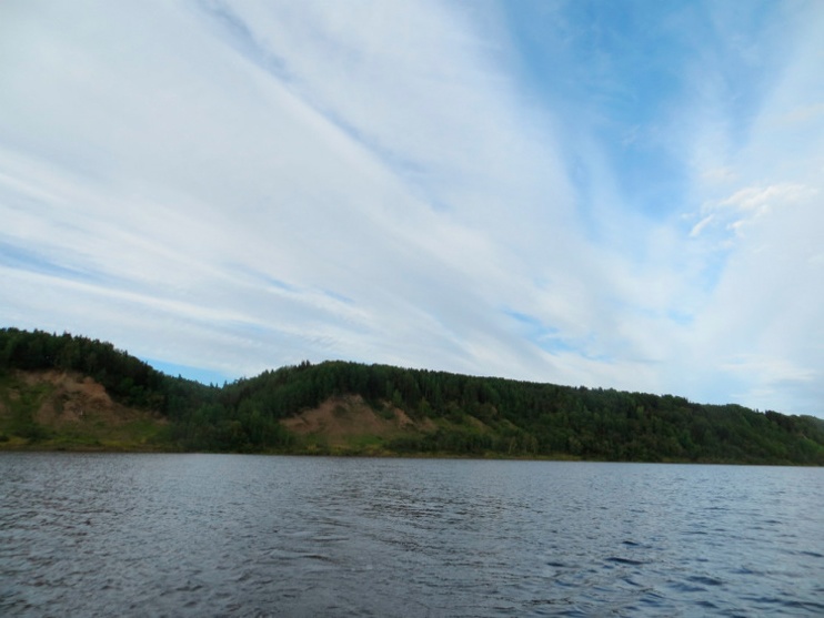 Выводили, долго, адреналин, кровь гудит в ушах и настрой на неделю. Смороды красной объелись. Словом. Места удивительные и по рыбе и по природе. Наконец, прогноз пообещал легкий ветерок на речке. Да к вечеру штилёк. Так, что усидеть дома прям преступление перед природой и собой тоже :-) Через час подъезжаем к берегу. Табличка «Охранная полоса реки», дальше «Машин не оставлять, идет разгрузка». И уютная гавань неузнаваема. Похоже, дорожники разгружали с барж песок на берег. Огромные колеи, глина выворочена по прибрежной полосе. К воде разве на тракторе можно подобраться. Береговая черта и уютный заливчик убиты в хлам. Находим колею от внедорожника, ель подползаем, как можно ближе. Перетаскиваем через грязюку вещи на берег. Накачиваем бригантину, грузимся, скорее от берега, от реалий производственной деятельности, подальше от умных слов, выражений, мыслей. Мотор взбрыкнулся, запыхтел. Потащил нас вверх по реке. Величественный склоны, нависающие деревья, с удовольствием задираю нос кверху, чтоб рассмотреть вершину отрога.