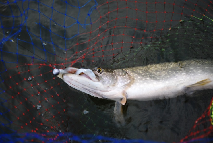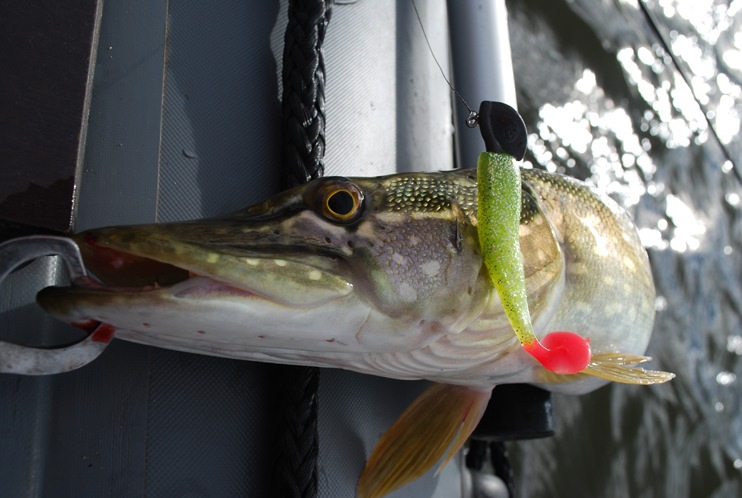Ловил опять на «Shaker» от «Lunker City». Основной размер 4.5 дюйма, а вот цветовые пристрастия на этот раз у рыбы были натуральными. Серебристо-белый «Ice Shad» кушала лучше всего. Лучшим весом головок при таком рельефе, течении и ветре было 18 грамм. Меньше не закинешь, больше слишком быстро падало. Итак все же закончим вопрос снастей и приманок и вернемся к непосредственно к рыбалке. Спустя некоторое время после поимки первой пятнистой красавицы обрыбился и я. Та же неуверенная аккуратная поклевка, вываживание и неплохая щука в лодке! Несколько забросов и ее сестренка следует за ней ко мне в руки.