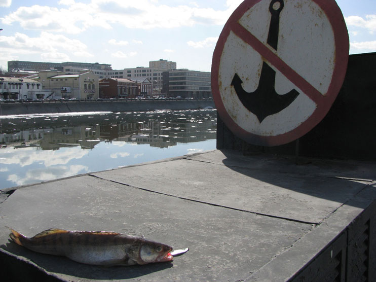 Недолго думая, отправляю блесну к месту очередного всплеска рыбы, о чем потом пожалел. Ведь не просто так, метрах в пяти от меня, висит знак «Причаливать запрещено», дающий понять, что тут меляк. Немного подергал блесну, и к счастью, она отцепилась.