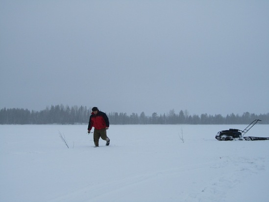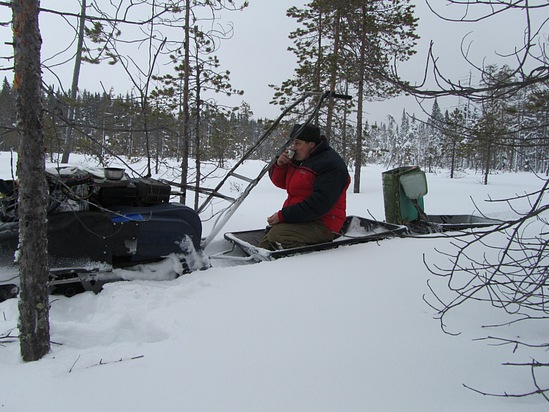 Километра четыре по буранке. Потом на болото свернули. Вначале просматривался позаметенный старый след, потом он свернул влево, нам же прямо торить. Километра через полтора в сосновом перелеске за ветром остановились.