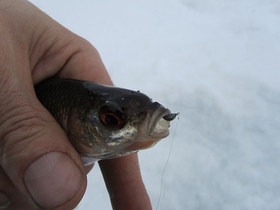 Делаю проводки со дна вверх. Мелкой трясочкой. Раньше и предположить не мог, что на голую мормышку рыбка ловится, ладно там хищный окушок зарится. Дак и ерш не против. За первым второй пожаловал. Сделал проводку повыше, Поклевочка. Посильнее предыдущей. Рыбка будто ударила вниз по кивку. Окушок! Чувствую, сопротивляется. Подвожу ближе. Ничего себе! Сорожка красноокая попалась.