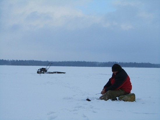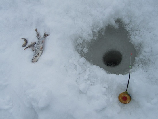 Если не клюет, то перемещаюсь на новую лунку. Заметил уж издавна, что после часу на озере рыба ленивее становится.