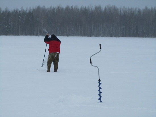 Беру бур, закладываю следующую дорожку лунок по направлению к берегу.