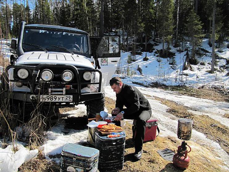 Жмём руки. Перекидываемся репликами по погоде, машинам, тайге. Кратка встреча. Быстрый завтрак. Смеемся над встреченными ими в прошлый раз шестьдесят восьмью УАЗиками, возвращавшимися колоннами с Пачозерья. Специально считали. Там и рыбы то не осталось. Пропускаем асов вперед. Сами за ними притуляемся.