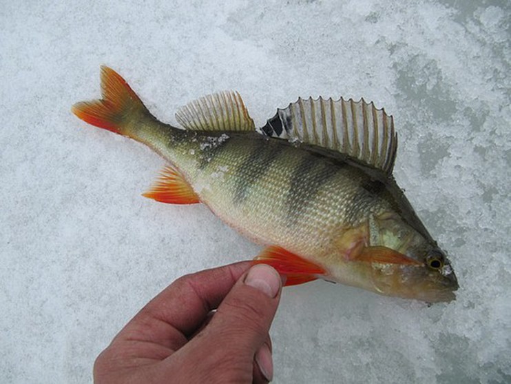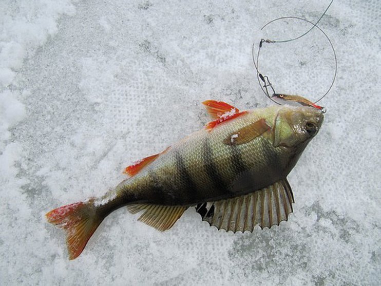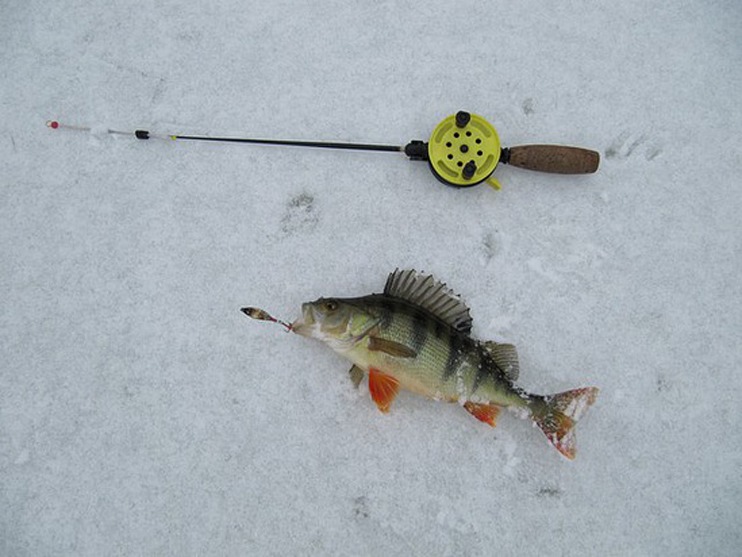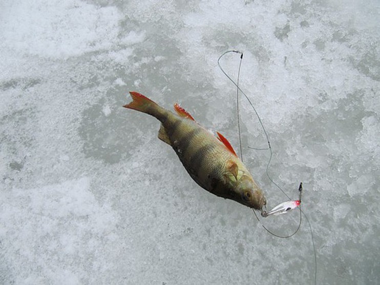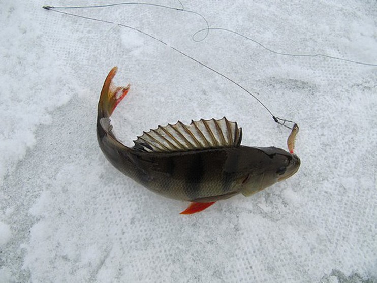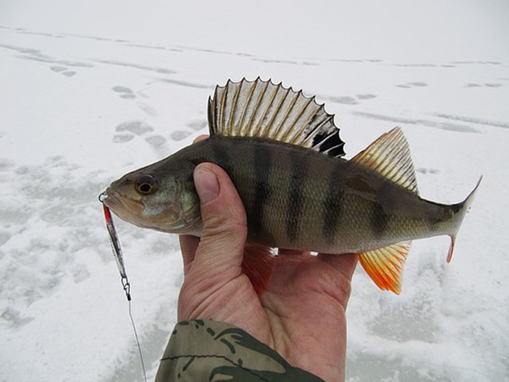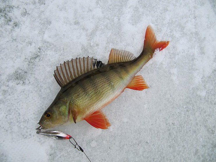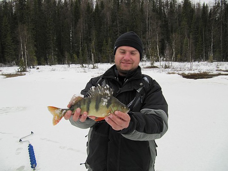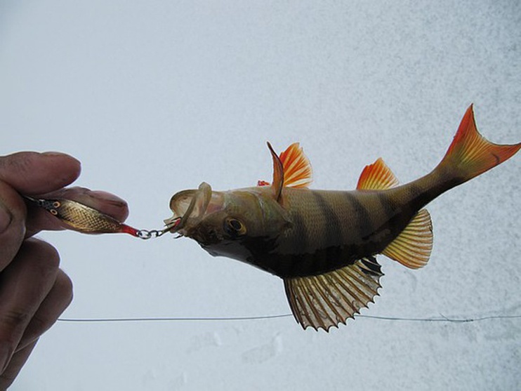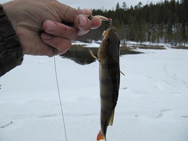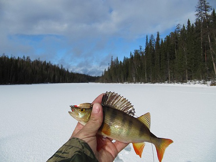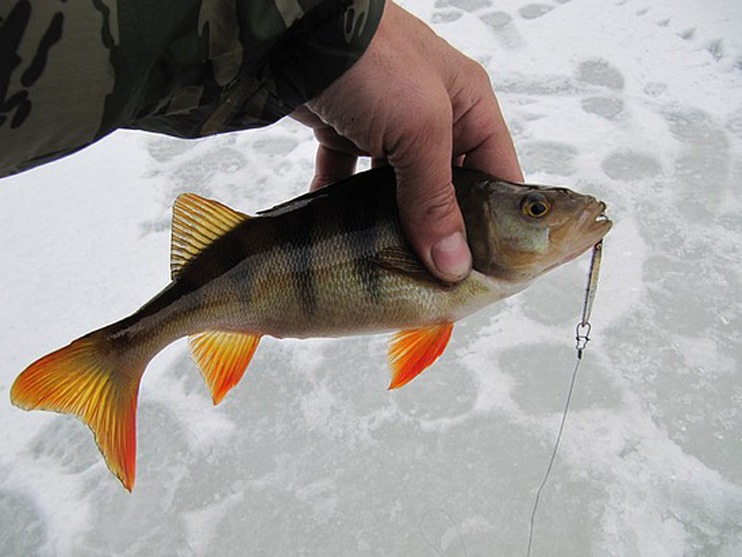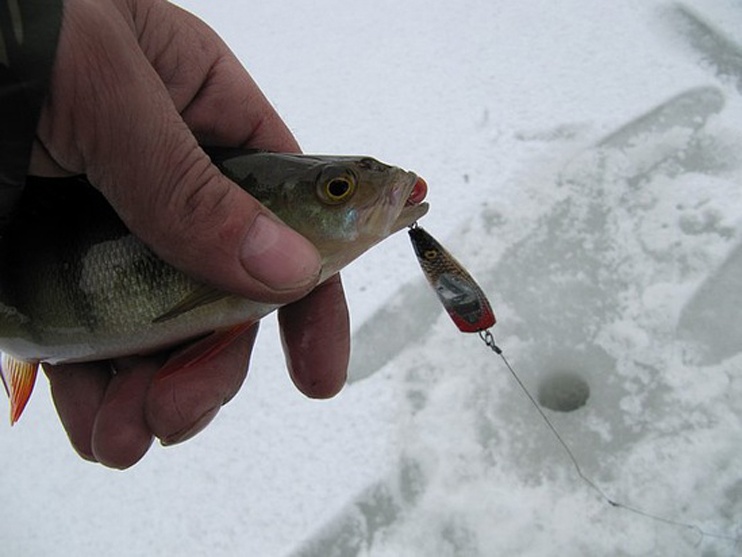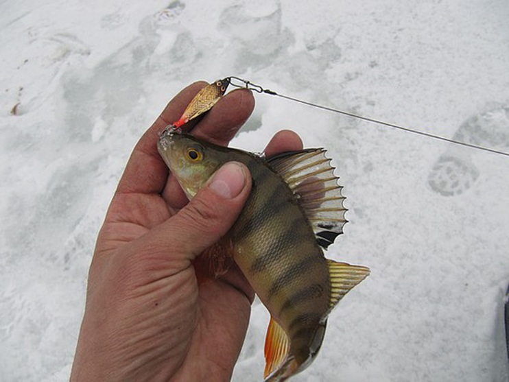 Только опускаю блесну сразу окунь. Бьёт будто ждал. Значит, он на большую блесну подходил, присматривал её, однако опасался схватить.
