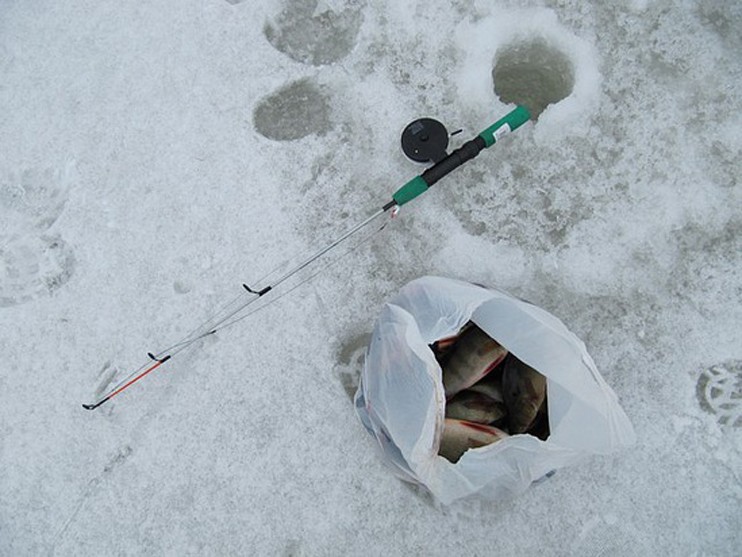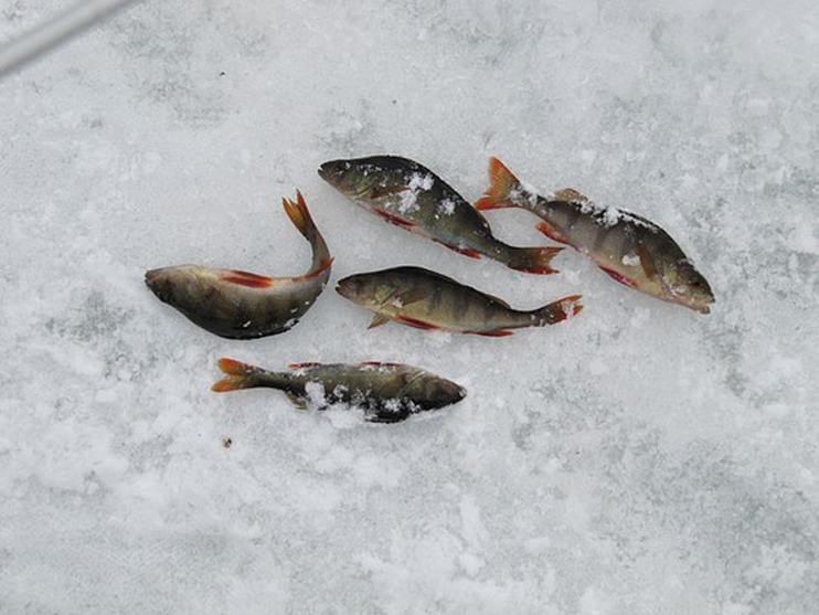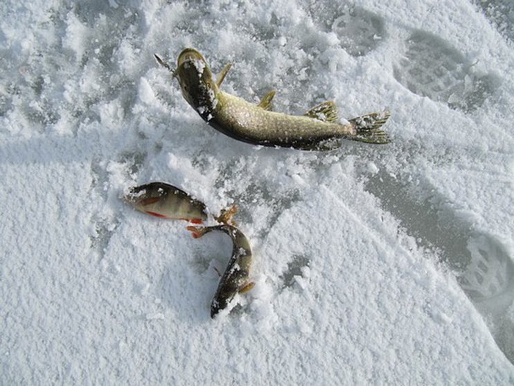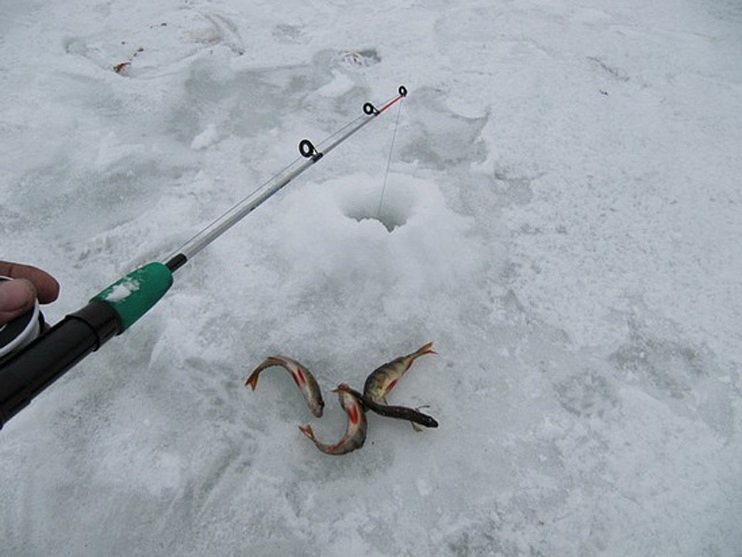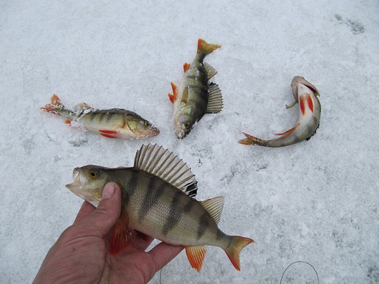 Напарник, поставив блесну, вытаскивает пару окуней. И перемещается вдоль берега на новую лунку.