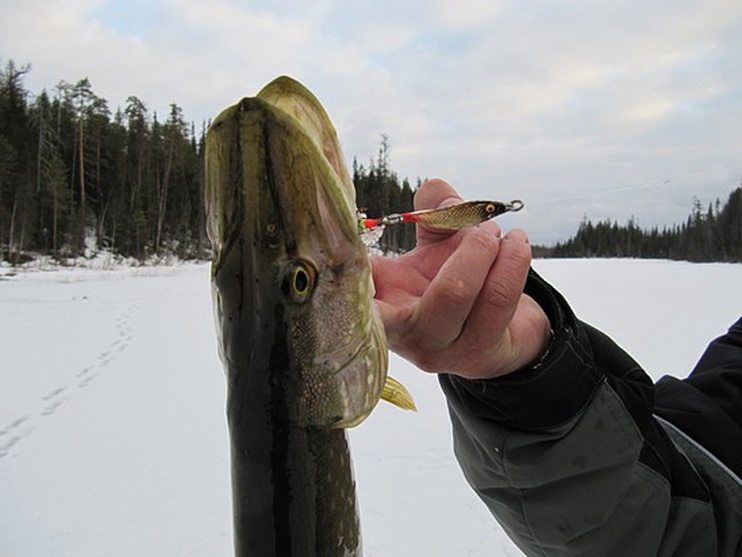 Товарищ зовет на помощь. Бегу к нему. Леска напряжена. Рыба рывками уходит в глубину. Постепенно подводим к лунке, не пережимая леску. При рывке медленно стравливаю сквозь пальцы. Заглядываю в лунку. Вижу мелькающую щучью пасть. Момент, на себя, и рыба пошла наверх. Саша моментально подхватывает в воде щучару под жабру. Еся!