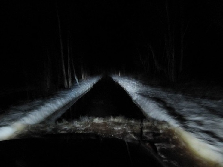 Легко переезжаем Злодейку. Взбираемся наверх и пошли по сосновому лесу. Фары выхватываю стволы, ветви, иногда кроны, дорога вьется и петляет. Машина проваливается в разбитые Лужины, выбирается на верх, бросается всем телом в право, на что-то натыкается, скользит, влево.