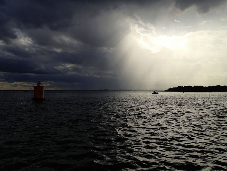 Ладога встретила нас ярким и по - летнему тёплым солнцем, облачностью «средней паршивости» и лёгким ветерком, создающим на бескрайних просторах пресноводного моря лёгкую рябь. В общем, погода шептала, и это не могло не радовать. Впрочем, радоваться ей нам было суждено недолго. Не прошло и получаса с того момента, как мы вышли на воду, на горизонте показался первый в тот день дождевой фронт. Освещаемые солнцем тучи выглядели несколько сурово. Несмотря на это, мы продолжали идти на вёслах к месту предполагаемой ловли, то и дело поглядывая на приближающуюся непогоду. Ветер, тем временем, усиливался. Делал он это очень академично, давая нам понять, что сделает всё, чтобы мы запомнили эту рыбалку надолго.